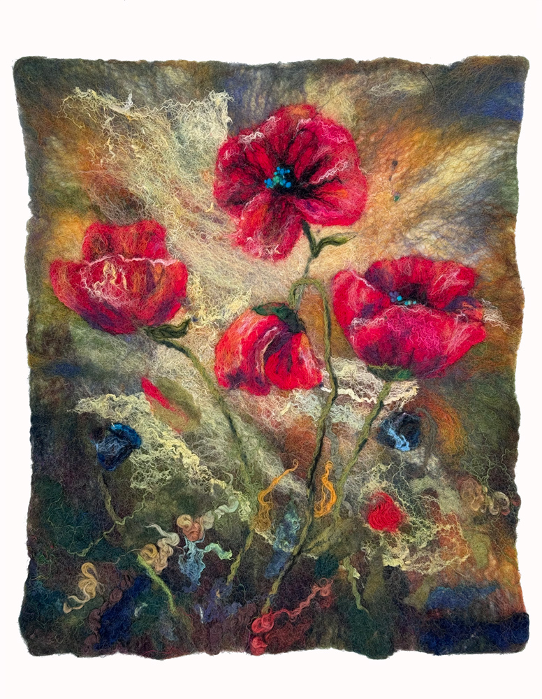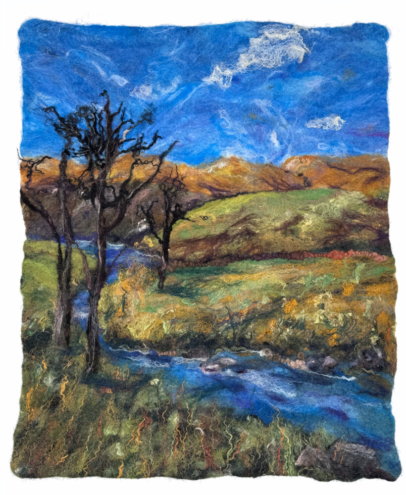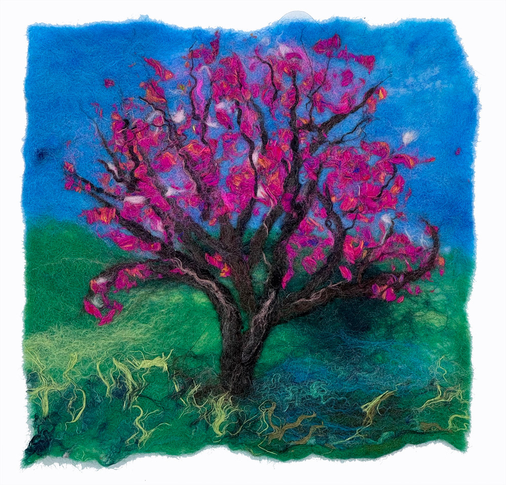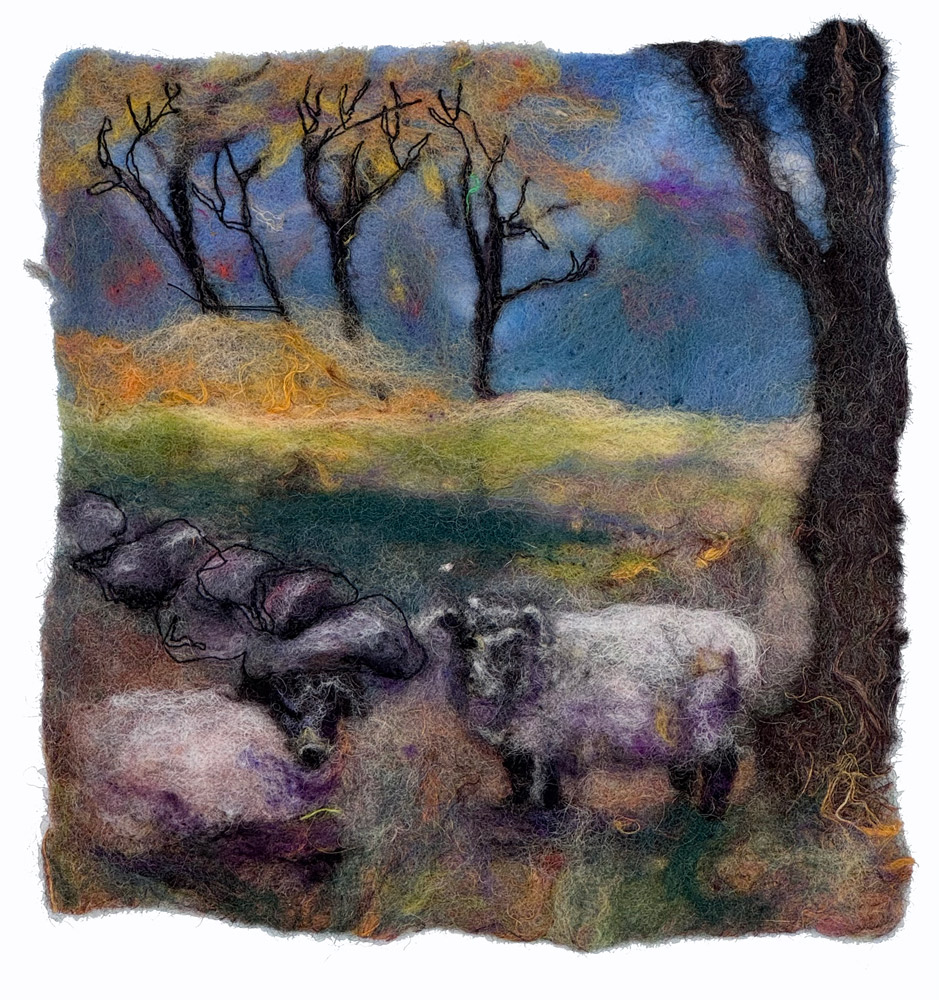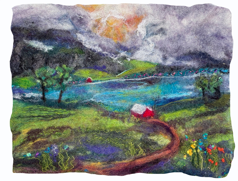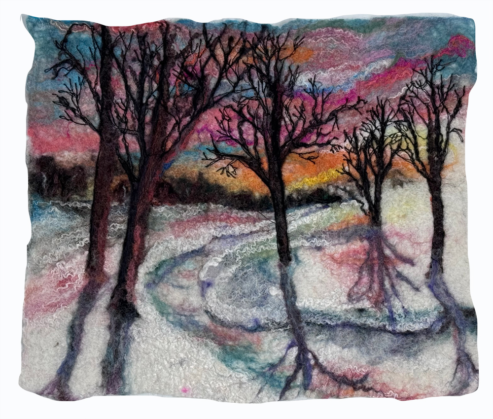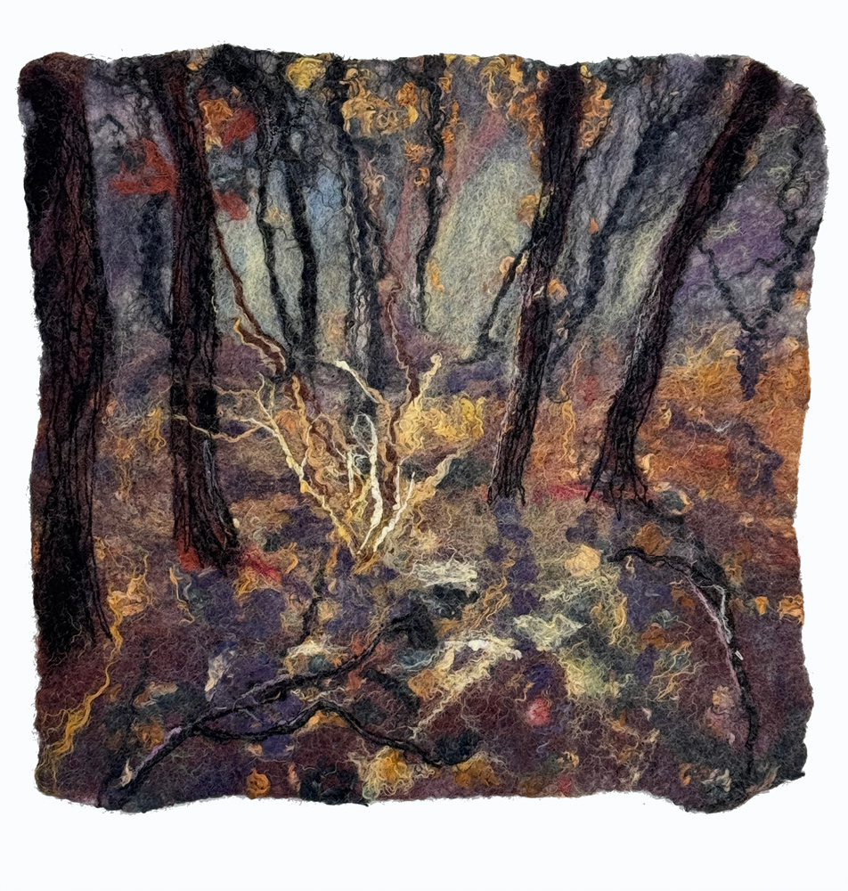 Wool paintings are very textured. Silk and other fibers add contrast to the surface. I enjoy experimenting with the effects that different fibers create when added to the wool. I can provide additional photos of the art and the framing if you are interested. I have additional art available that is not in the gallery because it was framed and not photographed before the web site was created. Please contact me for pricing and additional photos. Note that I am represented by the Woodland Gallery, 195 E Main St., Stoughton, WI. Work that is at the Gallery is so noted.