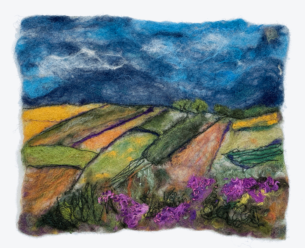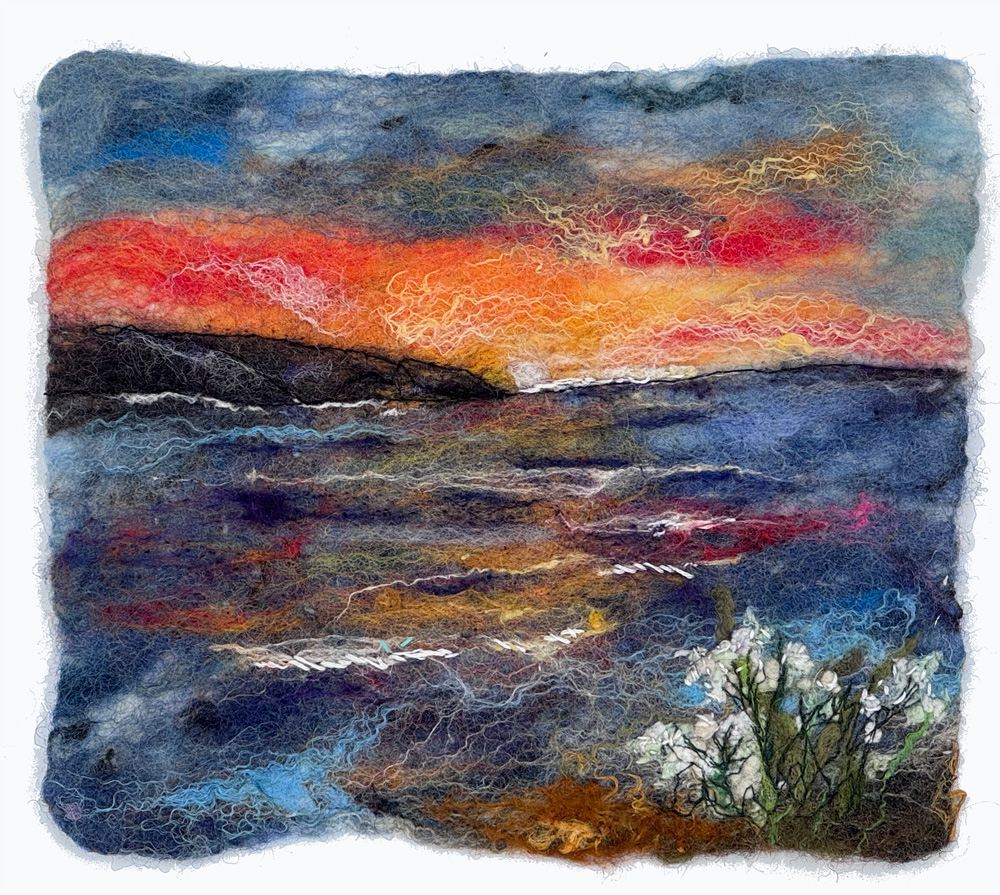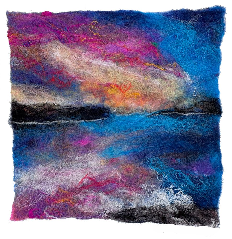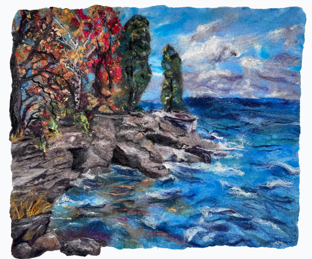 This dynamic image was inspired by a photo taken at Cave Point in Door County. It is wet filleted merino wool, silk, yarns, and silk hankies. The piece measures 19 x 25 and is framed to approximately 28 x 30. It is mounted on a textured gray mat in a brown frame.